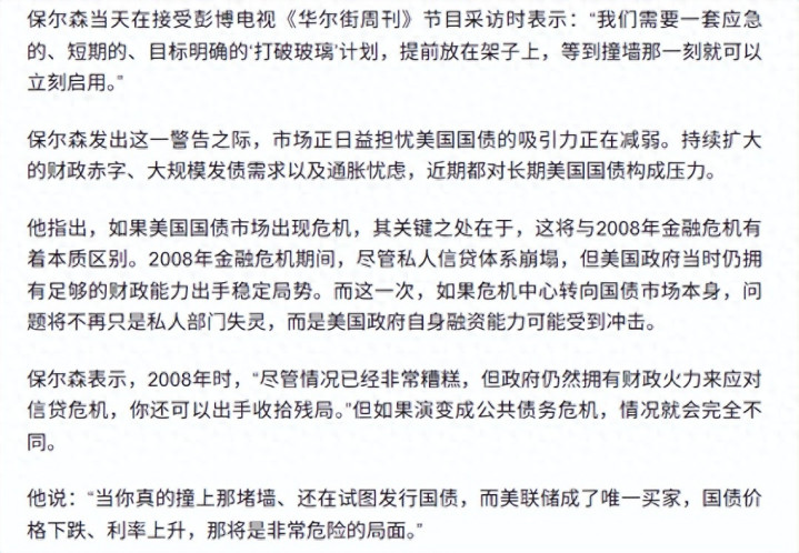《美债市场恐迎 “惨烈” 崩盘?美国前财长保尔森拉响警报》,环球网